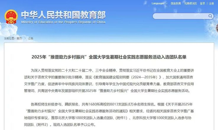 “推普助力乡村振兴”项目是由教育部语言文字应用管理司、共青团中央青年发展部共同主办。本次共有1680所高校的8013支团队8万余名师生报名。经教育部专家审议,学校赴新疆叶城县的“百村计划”推普助力乡村振兴志愿服务队入选全国重点团队,赴广西天等县的“青雁”推普助力乡村振兴服务队入选全国参与协同团队。
