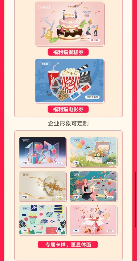 “鲁商福利猫”平台的核心优势在于其高度的定制化服务。企业可以根据自身需求,定制福利实体卡券的图案,让卡券独具特色,展现企业文化和关怀。平台还支持定制福利卡券类型,涵盖提货券、蛋糕券、电影券等多种类型,满足员工在不同场景下的消费需求。此外,福利卡金额也可根据企业预算进行灵活定制,实现精准福利分配。