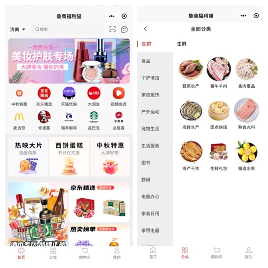 福利卡券可在“鲁商福利猫”平台进行消费,平台涵盖300+蛋糕品牌、10000+蛋糕门店、10000+影院,为员工提供了广泛的美食休闲选择。平台还整合了京东、天猫等知名电商的供应链资源,涵盖22大商品品类、70000+商品,确保商品品质与种类的丰富性。此外,平台还支持美团、肯德基、星巴克等生活性消费,满足员工日常生活的多样化需求。