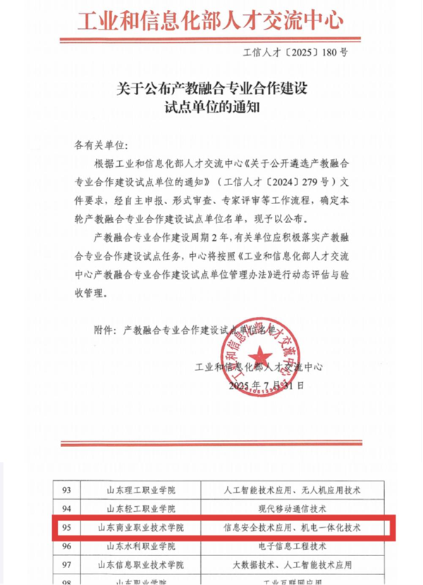 近日,工业和信息化部人才交流中心发布了“产教融合专业合作建设试点单位”名单,山东商职学院信息安全技术应用专业经过层层遴选,成功入选。