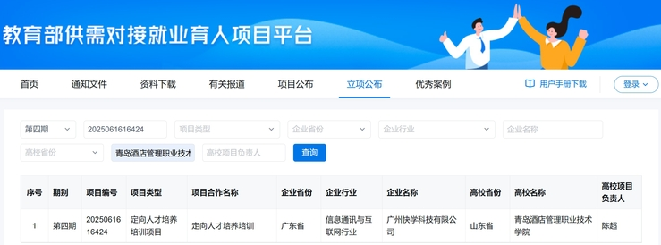 近日,教育部公布第四期最新供需对接就业育人项目名单,青岛酒店管理职院文旅学院与广州快学科技有限公司合作申报的“定向人才培养培训项目”入选。此次合作是深入践行“企业出题、校企共答、市场阅卷”产教深度融合理念的生动实践,为职业教育创新型人才培养模式落地提供了鲜活案例。