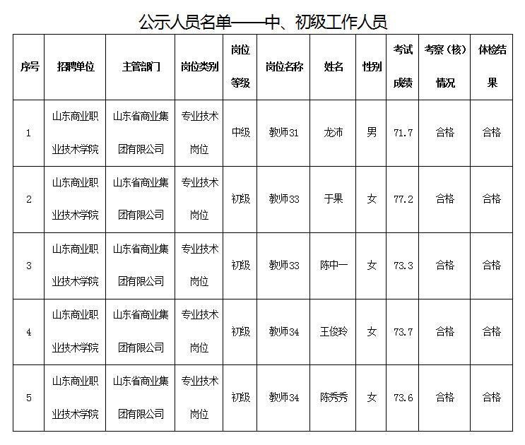 根据《关于做好2021年事业单位公开招聘工作人员有关问题的通知》(鲁人社字〔2020〕155号)等相关规定,按照岗位招聘计划,山东省商业集团有限公司所属山东商业职业技术学院组织完成了2021年中、初级工作人员招聘考试、考察、体检等工作,现对该单位拟聘用人员进行公示。公示期为7个工作日,自2020年10月19日至2020年10月27日(不含节假日)。公示期间,如对公示人选有异议,请及时向山东省商业集团有限公司反映。