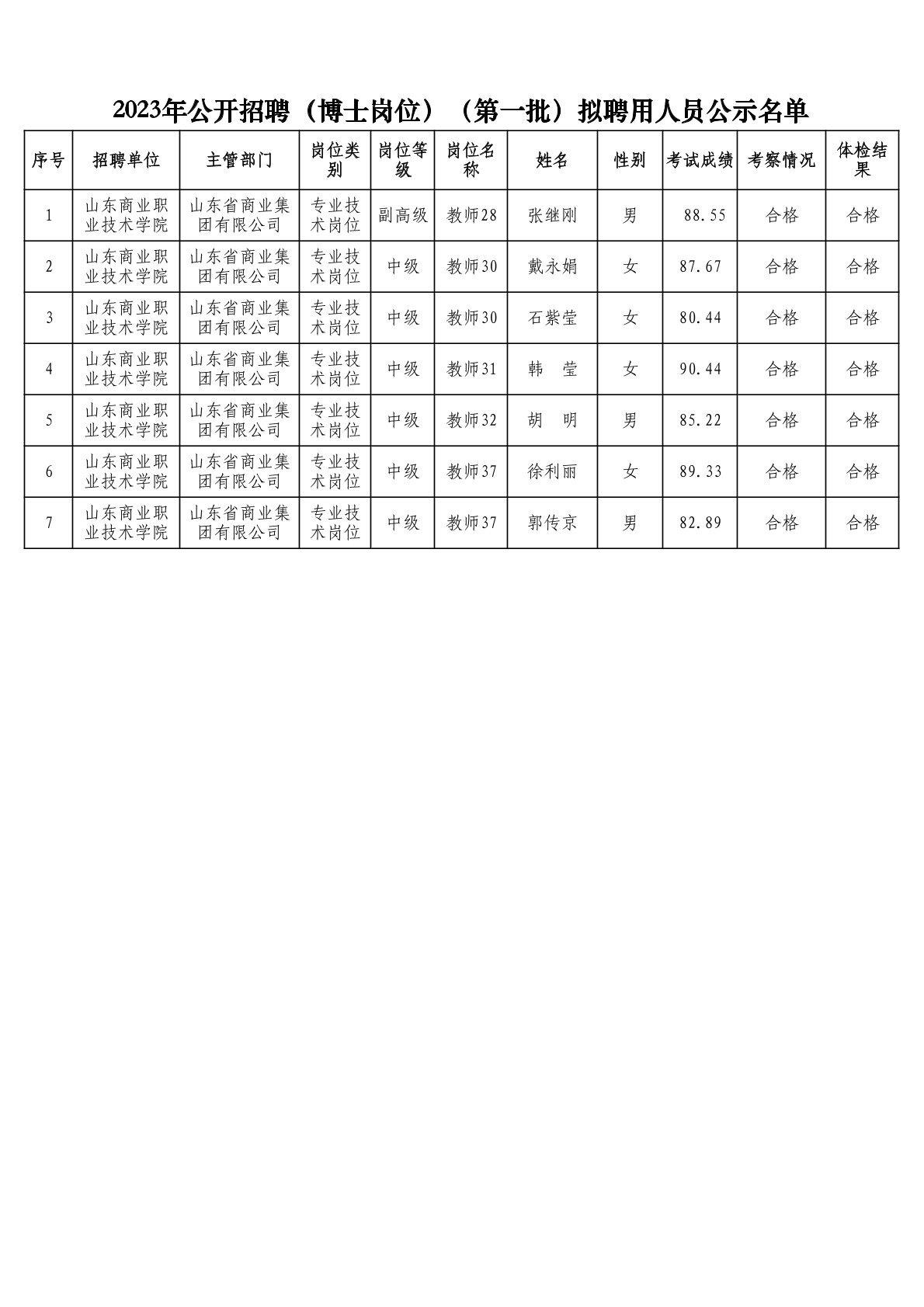 根据中共山东省委组织部、山东省人力资源和社会保障厅《关于印发2023年度省属事业单位公开招聘工作实施方案的通知》(鲁人社发〔2022〕23号)和省属事业单位公开招聘有关政策规定,按照岗位招聘计划,山东商业职业技术学院组织完成了2023年公开招聘(博士岗位)(第一批)工作人员考试、体检、考察等工作,现对该单位拟聘用人员进行公示。公示期为7个工作日,自2023年11月13日至2023年11月21日(不含节假日)。公示期间,如对公示人员有异议,请向山东省商业集团有限公司组织人力资源部反映。反映问题要实事求是,并告知真实姓名及联系方式。