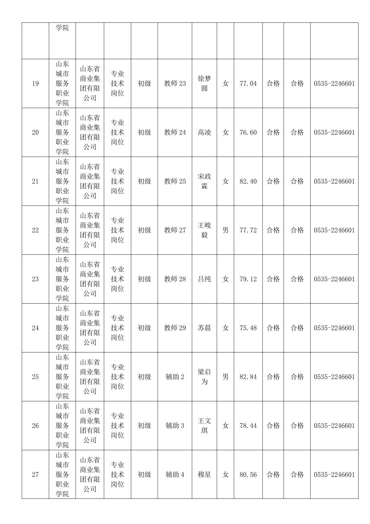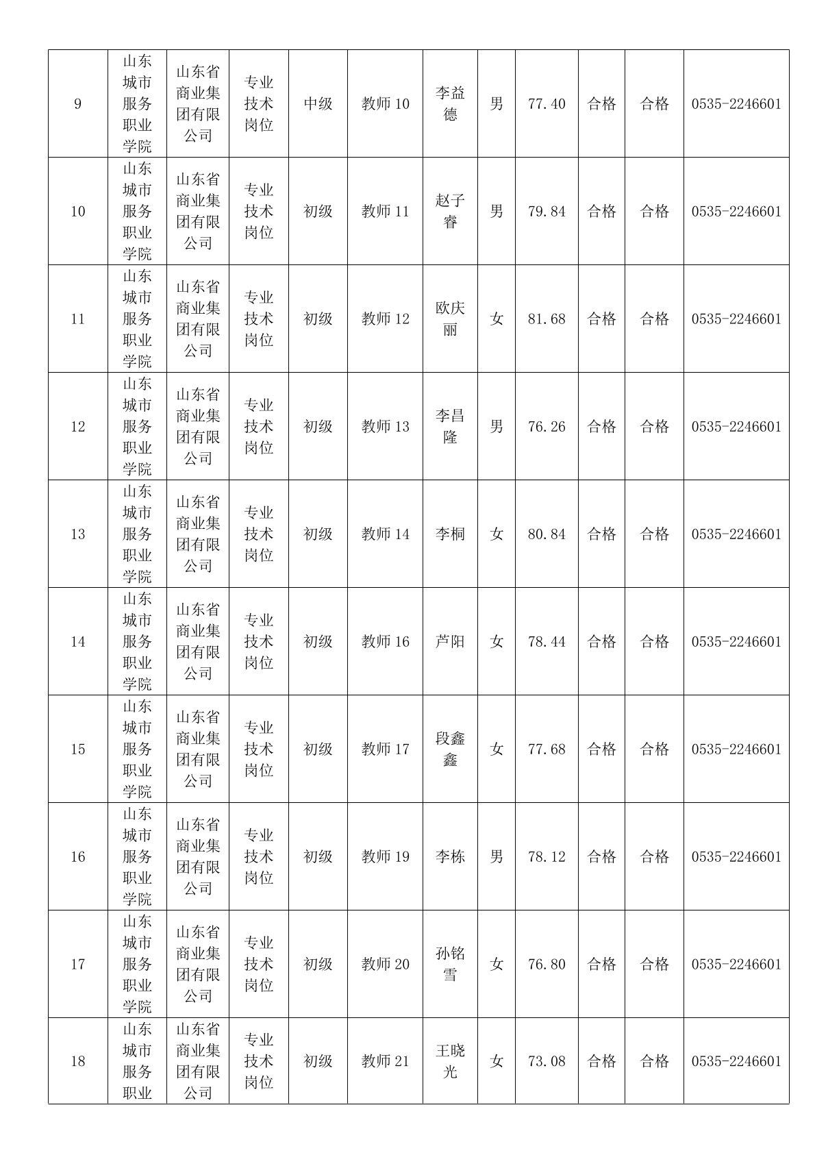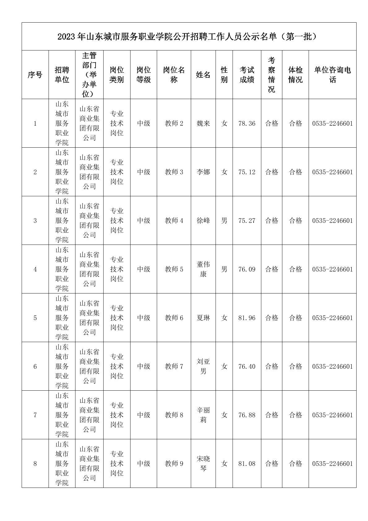 根据《中共山东省委组织部、山东省人力资源和社会保障厅关于印发2023年度省属事业单位公开招聘工作实施方案的通知》(鲁人社发〔2022〕23号)等相关规定,山东城市服务职业学院经过公开招聘报名、考试、考察、体检等工作,现对拟聘用人员(第一批)进行公示,公示期为7个工作日,自2023年11月20日至2023年11月28日(不含节假日)。公示期间,如对公示人选有异议,请及时向山东省商业集团有限公司反映。