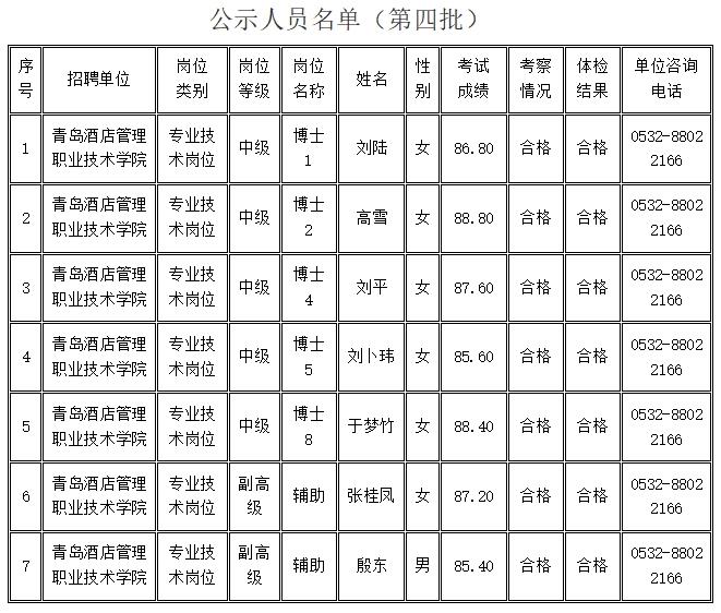 根据省属事业单位公开招聘有关政策规定,按照岗位招聘计划,青岛酒店管理职业技术学院组织完成了公开招聘考试、考察、体检等工作,现对该单位第四批拟聘用人员进行公示。公示期为7个工作日,自2024年7月10日至2024年7月18日(不含节假日)。公示期间,如对公示人选有异议,请向山东省商业集团有限公司反映。反映问题要实事求是,并告知真实姓名及联系方式。